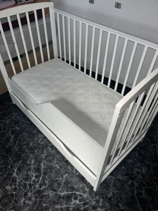 CUNA para bebe, ideal para hacer COLECHO o para que el bebé duerma solo, dispone de barandilla y se puede graduar tanto la barandilla en altura, como el colchón. En la altura más baja quedaría el colchón respecto al suelo a unos 42cm y la altura máxima serían unos 62cm 5 alturas en total. Cambiador de bebé de Regalo. Colchón Nuevo a Estrenar.