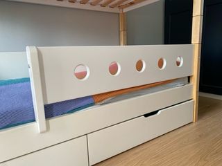 Barandilla cama Flexa, incluye poste corto y tornilleria necesaria. El poste corto y la barrera cuestan 100€ nuevos. Está en buen estado, con alguna marca de uso leve.