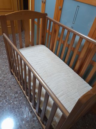 Cuna de madera en perfecto estado. Barandilla móvil para poder acceder a la cuna con mayor facilidad. Colchón con muy poco uso, se utilizaba en una segunda vivienda. Se vende a parte por 10€