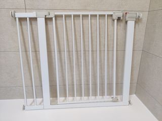 Barandilla de seguridad de la marca 1st, ideal para pasillos o escaleras. Su diseño blanco se adapta a cualquier hogar. - Construcción robusta. - Mecanismo de cierre seguro. - Fácil instalación. Preciosa barandilla de seguridad para niñ@s y mascotas de la marca Safety first. Está prácticamente nueva. - Modelo U-Pressure Fit Easy Close Metal. - Extensión de 14 cm incluida. - Medidas: 73-80cm (min-max). - Fácil cierre automático. - Material metálico, color blanco. A parte puedo vender las extensión