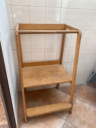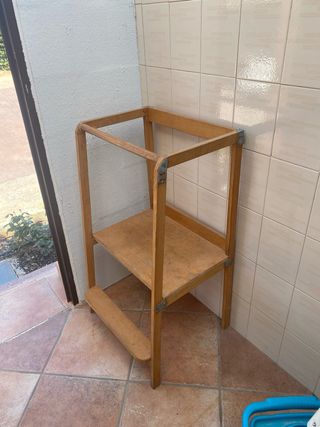 Preciosa torre de aprendizaje para niños, ideal para que los más pequeños puedan participar en las tareas de la cocina o el baño. Está en buen estado, aunque muestra señales normales de uso. - Estructura de madera resistente. - Escalón integrado para facilitar el acceso. - Barandilla superior para mayor seguridad.