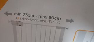 Barandilla seguridad protectora y 2 extensiones/ampliaciones. Ancho minimo 73cm puede ampliarse max 80cm Regalo 2 modulos de ampliacion 14cm cada uno. No necesita agujeros. Marca Safety first Precio innegociable. No se realizan envios.