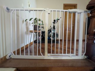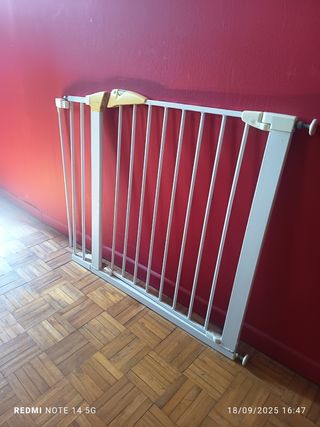 Barandilla de seguridad de la marca 1st, ideal para pasillos o escaleras. Su diseño blanco se adapta a cualquier hogar. - Construcción robusta. - Mecanismo de cierre seguro. - Fácil instalación. Preciosa barandilla de seguridad para niñ@s y mascotas de la marca Safety 1st. Está prácticamente nueva. - Modelo U-Pressure Fit Easy Close Metal. - Extensión de 14 cm incluida. - Medidas: 73-80cm (min-max). - Fácil cierre automático. - Material metálico, color blanco. A parte puedo vender las extensión