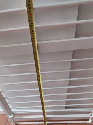 Barandilla de seguridad para escaleras, ideal para proteger a los más pequeños. Medidas: se puede adaptar al ancho del lugar donde se va a instalar. Se vende con un extensible. Sin extensible mide 76 cm. Con el extensible mide 85 cm a 95 cm aproximadamente. Hay 2 barandillas 30 euros una, si te llevas las dos 50 euros.