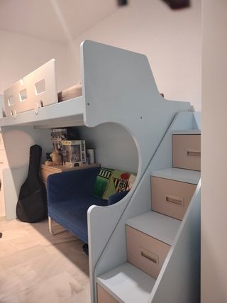 Litera nido 190x90 en madera maciza + MDF, protegida con dos capas de laca para mayor resistencia al uso diario. Incluye barandilla de seguridad, escalera cómoda, cabeceros de 4 cm, 2 amplios cajones extraíbles con ruedas (fondo 100 cm) y jardinera lateral. Se entrega con 2 colchones viscoelásticos 190x90 en muy buen estado. Poco uso, muy cuidada, ideal para habitación infantil o juvenil. Diseño funcional que optimiza el espacio y ofrece gran capacidad de almacenaje. Lista para usar. Entrega inmediata en mano. Precio negociable.