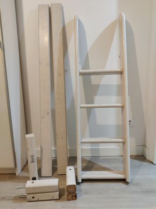 Kit de escalera y barandilla para litera de la marca Flexa. Incluye todos los accesorios necesariospara su montaje. - Escalera de madera. - Barandilla de seguridad. - Tornillería y tacos de madera. Tiene rascadas y desgastes del uso. Opcional la barandilla de la cama de abajo por 20 € más No se hacen envíos. Se recoge en Santa Adrià centro.