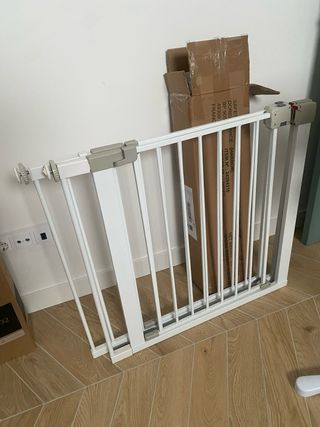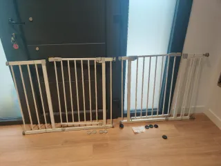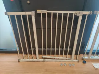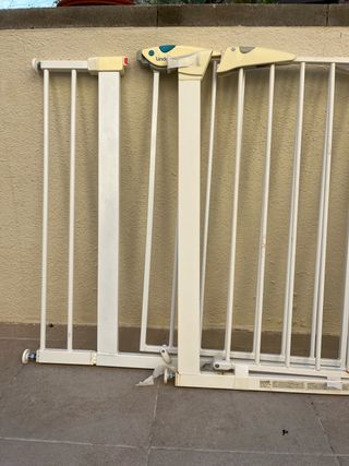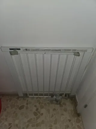 Valla de seguridad de metal blanco, ideal para proteger escaleras o delimitar espacios. - Estructura de barrotes metálicos. - Color blanco. - Mecanismo de apertura y cierre. Desgaste del uso. Compré el producto por vinted pero no es compatible con mi barandilla