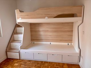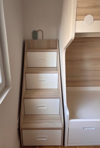 Cama compacta infantil en excelente estado, con solo 1 año de uso. Mueble de alta calidad, diseño moderno en tonos madera clara y blanco, muy cuidada. - Estructura robusta y muy estable - Litera superior con barandilla de seguridad - Escalera con cajones integrados. -Amplios cajones inferiores para almacenaje. - Diseño moderno y funcional. 💰 Precio: 950 € (Precio original: 1.800 €) 📦 Desmontaje y transporte a cargo del comprador 📍 Recogida en mano