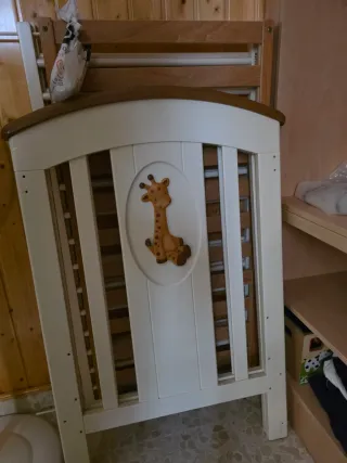 Cuna de bebé con un bonito diseño. Incluye colchon en perfecto estado de alta calidad - Color blanco y madera. - Detalle de jirafa en el panel frontal. - Estructura de barrotes.