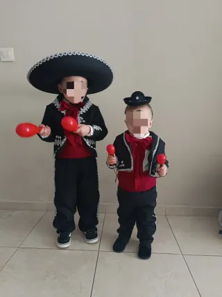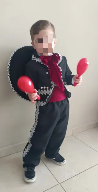 Conjunto de disfraz de mariachi perfecto para fiestas o eventos. - Incluye chaqueta, pantalón y sombrero. - Detalles plateados. - Lazo y fajín rojo. - Maracas. 20€ cada disfraz con todo incluido.
