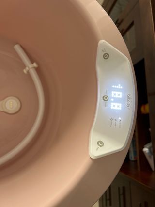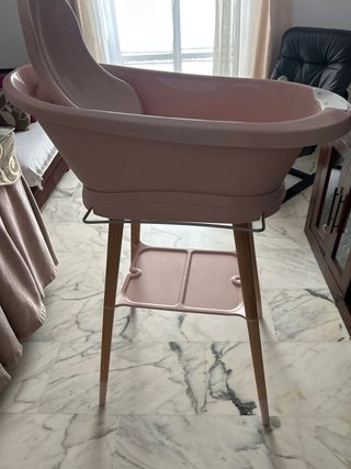 Bañera para bebé de la marca Bebe Jou en color rosa, con soporte. - Diseño ergonómico. - Soporte de madera y plástico. - Bandeja inferior para accesorios. - mide temperatura agua ,tiempo de baño