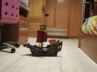 Barco pirata de Playmobil con todas sus figuras y accesorios originales. El barco esta en buenas condiciones, tiene un par de piecitas que por estar guardado medio mal se han roto, pero son sujecciones que con un pelin de loctite ni se notan porque no quedan a la vista. Esta a falta de una limpieza y arreglar esos 2-3 pequeños detalles y queda de exposicion. Tiene todas las piezas originales guardadas en la bodega. Es para alguien que le guste como hobbie y le quiera dar un poco cariño, los he visto entre 120 y 150 en buenas condiciones por eso el precio que pongo creo que es más que justo.