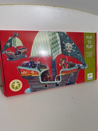 Barco pirata de cartón para montar y jugar, de la marca Djeco. - Modelo Pop to Play 3D. - Incluye figuras de piratas. - Diseño con calaveras y anclas. Se regalan 2 piratas para completar