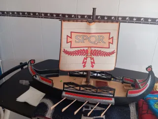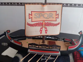 Barco de estilo romano de Playmobil, ideal para coleccionistas o para jugar. - Diseño detallado con vela. - Incluye remos. - Colores negro, rojo y madera.