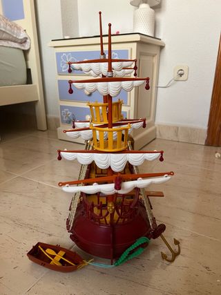 Barco de juguete de Peter Pan, ideal para coleccionistas o para jugar. - Diseño detallado con mástiles y velas. - Incluye un bote auxiliar y un ancla. - Colores rojo y amarillo predominantes. Le faltan piezas, se entrega en mano