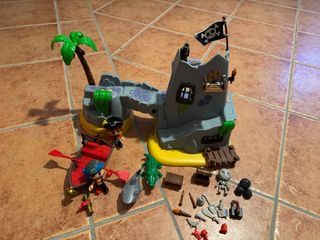 Set de juego de Pinypon con temática pirata, incluye isla, castillo y barco. - Isla con palmera y cascada. - Castillo pirata con bandera. - Barco rojo con remos. - Figuras de piratas. - Accesorios como cañones, tesoros y animales marinos.