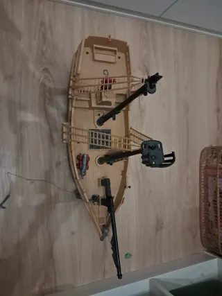 Barco pirata de madera con detalles de piratas. - Velas a rayas rojas y blancas con calavera. - Mástil con cuerdas y escaleras. - Cañón en la cubierta. Solo que está un poco oscuro las velas por estar con un poco de polvo.se tendría q lavar . No hago envios