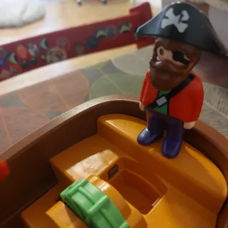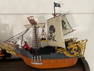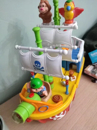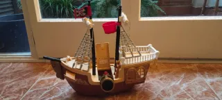 Divertido barco pirata de juguete con luces y sonidos. - Incluye figuras de piratas, mono y loro. - Mástiles con velas. - Timón. - Cañón.