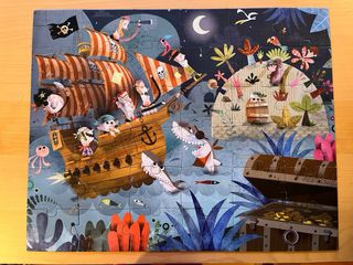Puzzle de la marca Djeco con un divertido diseño de un barco pirata. - 54 piezas. - Ilustración colorida y detallada. - Forma del puzzle irregular.