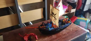 Barco pirata de juguete con detalles de dragón y calaveras. - Figuras de piratas incluidas. - Velas con diseño de calavera. - Mástil con red y bandera pirata.