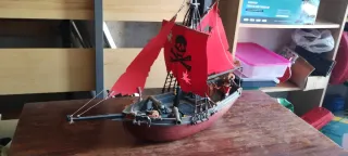 Barco pirata de Playmobil con velas rojas y calavera. - Diseño detallado de barco pirata. - Incluye figuras de piratas. - Velas rojas con estampado de calavera.