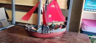 Barco pirata de Playmobil con varios muñecos. - Barco de color marrón y rojo. - Velas rojas con calaveras. - Cañones. - Incluye figuras de piratas.