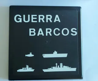 Tablero de juego de Guerra de Barcos de los años 80. Incluye representaciones de diferentes tipos de embarcaciones. - Diseño en blanco sobre fondo negro. - Ilustraciones de un submarino, un portaaviones, un destructor y un acorazado.