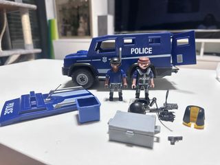Set de Playmobil que incluye un coche de policía y una barca. IMPORTANTE!!!! TENGO LO QUE VES!!!! - Coche de policía azul con detalles blancos y POLICE escrito. - Dos figuras de policías con uniformes. - Accesorios como escudo, caja, casco y pistola.