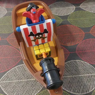 Divertido barco pirata de Fisher-Price, ideal para horas de juego. - Incluye figuras de pirata y mono. - Bandera pirata con calavera. - Cañón y pelota. - Rueda de timón. - Luces y sonidos.