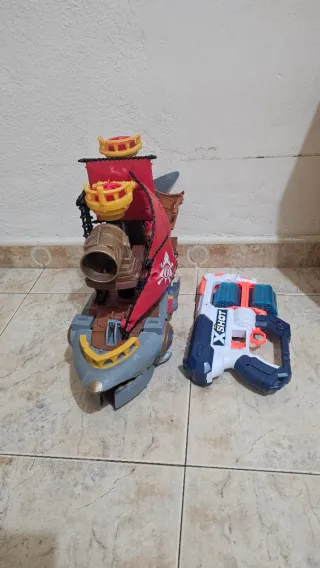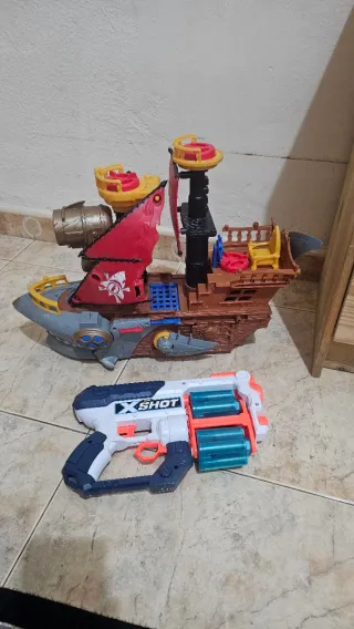 Set de juego de barco pirata y pistola. - Barco pirata con detalles. - Pistola de juguete. - Incluye 12 balas.
