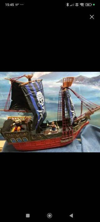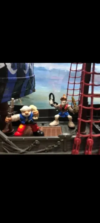 Barco pirata de madera, en buen estado. Ideal para juegos infantiles. - Fabricado en madera. - Diseño detallado con mástiles y escaleras. - Incluye una base azul para simular el mar. - Perfecto para juegos de piratas.