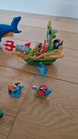 Lote Piratix. Incluye: 1. Tiburón articulado con jaula. Contiene Tiburón, Tesoro Exclusivo, Piratix Exclusivo y accesorio. 2. Barco pirata con forma de loro. Incluye Barco, 2 Piratix Exclusivos, Tesoro Exclusivo y accesorio. 3. Tres cajas golden treasure. Cada caja incluye 1 Piratix, 1 Tesoro y 1 bandera. En total son 20 Piratix, un Tiburón, 1 Barco loro, 1 Cañón y 3 Cajas de Tesoro. Apenas utilizado, como nuevo.