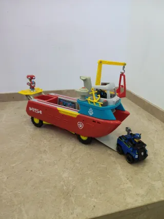 Vendo Barco Patrulla Canina (PAW Patrol Sea Patroller) Incluye: Montacargas rojo. Figura de Ryder. Marshall con mochila que enciende luces. Regalo especial: Chase (edición con casco) con su vehículo. Todo funciona correctamente. El barco se convierte en vehículo terrestre, tiene rampa desplegable y zona de rescate. Perfecto para fans de PAW Patrol. Su precio original es de 110 €. Precio rebajado para vender rápido.