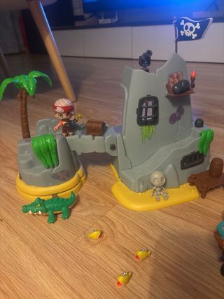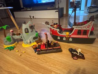barco pirata con isla y barca pequeña lleva todos los accesorios 4 muñecos completos, pulpo,cocodrilo, pirañas... cañon etc