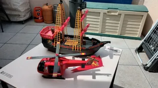 Set de juguetes compuesto por un helicóptero rojo y un barco pirata. - Helicóptero de juguete con hélices. - Barco pirata con mástiles y velas rojas. El helicoptero está en perfecto to estado. El barco tiene rota una vela y parte del timón. 30