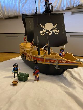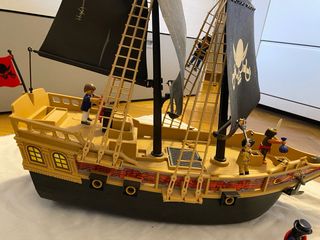 Set de barco pirata Playmobil con varias figuras de piratas. - Barco de juguete con velas negras y bandera pirata. - Incluye figuras de piratas con accesorios. - Ideal para coleccionistas y amantes de Playmobil.