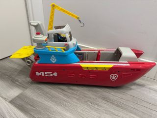 Barco de juguete de la Patrulla Canina. - Diseño en rojo, azul y amarillo. - Incluye grúa y plataforma. - Detalle de logo de la Patrulla Canina.