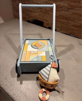 Little dutch Carrito Andador +Barco Música Azul Carrito andador de madera con bloques de construcción y un barco de peluche. Little dutch Pecio nuevo: €66 + €20 = €86 - Diseño en tonos azules y madera. - Incluye bloques con diferentes diseños. - El barco de peluche tiene detalles de rayas y un salvavidas. - Incorpora un elemento musical.