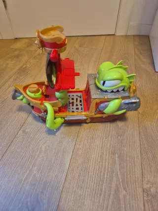 Divertido juguete de barco pirata con múltiples detalles. - Velas rojas con diseño de calavera. - Accesorios de juego incluidos: Tesoro , pirata tiburón y jaula, falta bola de cañón. Abre y cierra la boca del barco tiburon. La puerta del tesoro abre con mecanismo, una parte se queda abierta. Aletas con movimiento y puerta y trampa.