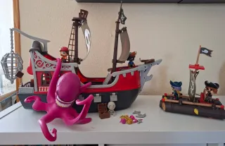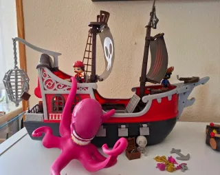Set de juego de barco pirata Pin y Pon con divertidos accesorios. - Barco pirata con detalles rojos y negros. - Incluye un pulpo morado. - Figuras de piratas. - Accesorios adicionales como cañones y tesoros. Precio completo 35€ puede venderse separado barco 25 y balsa 15, ambos incluyen dos piratas mas accesorios