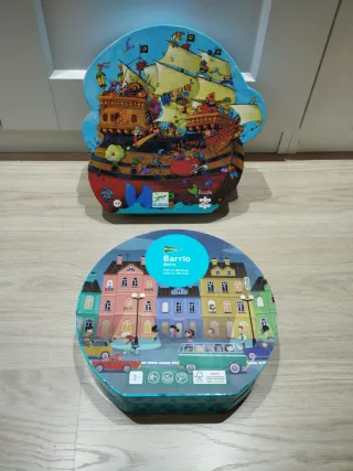 Dos puzzles infantiles para horas de diversión. - Puzzle de barco pirata con forma. 4€ - Puzzle redondo de barrio con casas y vehículos. 4€
