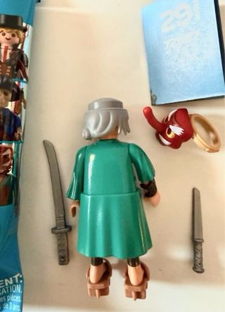 Set de Playmobil del barco pirata número 3860. Incluye figuras y accesorios. - Cuatro figuras de piratas. - Tres cañones. - Ancla. - Timón amarillo. - Accesorios varios como espadas y barril. Tenía dos barcos pirata, así que hay más accesorios y también faltan algunos.