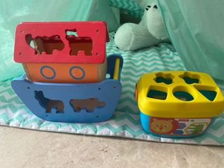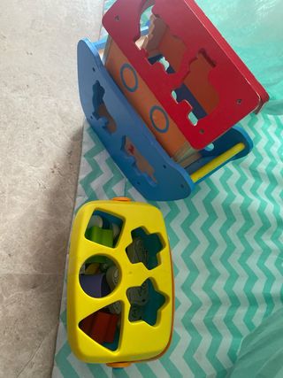Set de juegos para bebés enfocado en la psicomotricidad. - Barco de madera con figuras de animales. - Caja de formas de plástico con diferentes figuras.