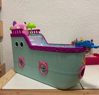 Barco de juguete inspirado en Gabby Dollhouse, con un diseño divertido y colorido. - Tonos pastel en verde menta y rosa. - Detalles de gatitos en los laterales. - Incluye piscina con accesorios como sombrilla y tumbona. Precio Negociable