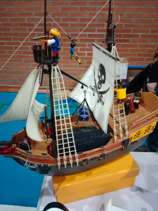 Barco pirata de Playmobil, serie 5135. - Incluye figuras de piratas. - Velas con diseño de calavera. - Mástiles y escaleras detalladas.