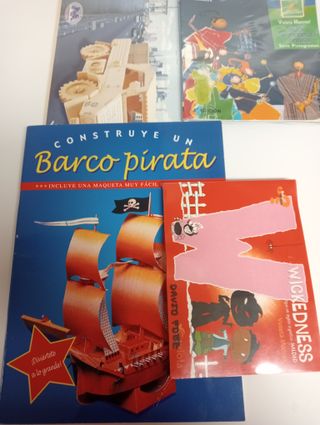 LOTE RECORTABLE NUEVO BARCO PIRATA , MAQUETA PARA CONSTRUIR UN CAMION DE MADERA NUEVA, 2 LIBROS FIRMADOS DE VIOLETA MONREAL USADOS - Libro Construye un Barco Pirata con maqueta. - Libro Wickedness de Violeta Monreal.