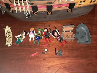 Galeón pirata de Playmobil, de la referencia 3940. Es del año 2000. Bastante completo. Se vende con las piezas, muñecos y accesorios que se ven. Las velas son las originales. Sin caja. Hago envíos.