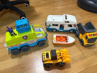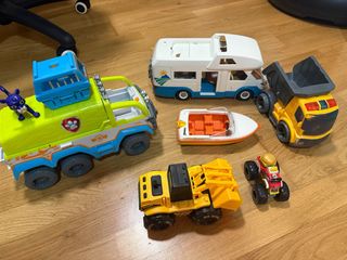 Conjunto de juguetes de vehículos para niños. SE VENDE EL LOTE - Camión amarillo con volquete. - Camión de Paw Patrol verde y azul. - Autocaravana blanca y azul. Playmobil - Barco blanco con asientos naranjas. Plaympbil - Monster Truck rojo con hamburguesa.