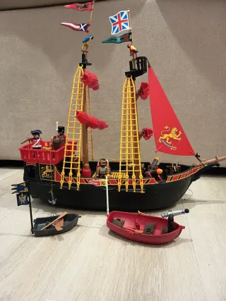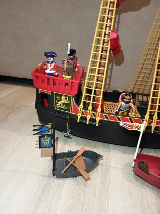 Barco pirata de madera con todos sus accesorios. - Figuras de piratas incluidas. - Velas a rayas rojas y blancas. - Bandera pirata con calavera. - Escalera de acceso. - Pequeño bote auxiliar.