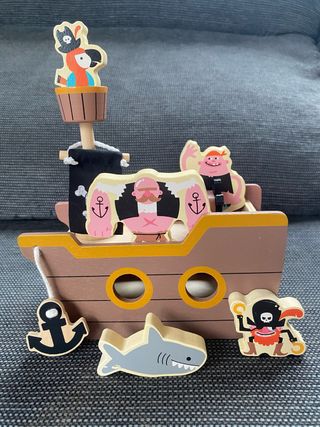 Juguete de barco pirata de madera con divertidas figuras. - Barco de madera con diseño de piratas. - Incluye figuras de piratas, loro, tiburón y ancla. - Piezas de madera pintadas a mano.